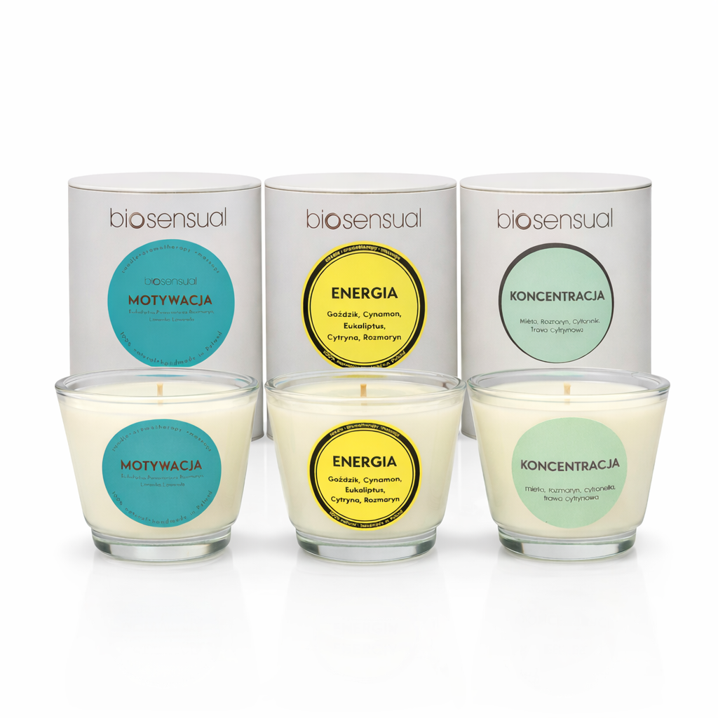 Zestaw egzaminacyjny świec Biosensual to naturalne wsparcie dla koncentracji, jasności umysłu i energii podczas nauki, pracy oraz przygotowań do ważnych egzaminów. W zestawie znajdują się trzy starannie dobrane świece aromaterapeutyczne: Motywacja, Energia i Koncentracja, które dzięki kompozycji naturalnych olejków eterycznych pomagają zwiększyć skupienie, pobudzić umysł oraz stworzyć atmosferę sprzyjającą efektywnej pracy.